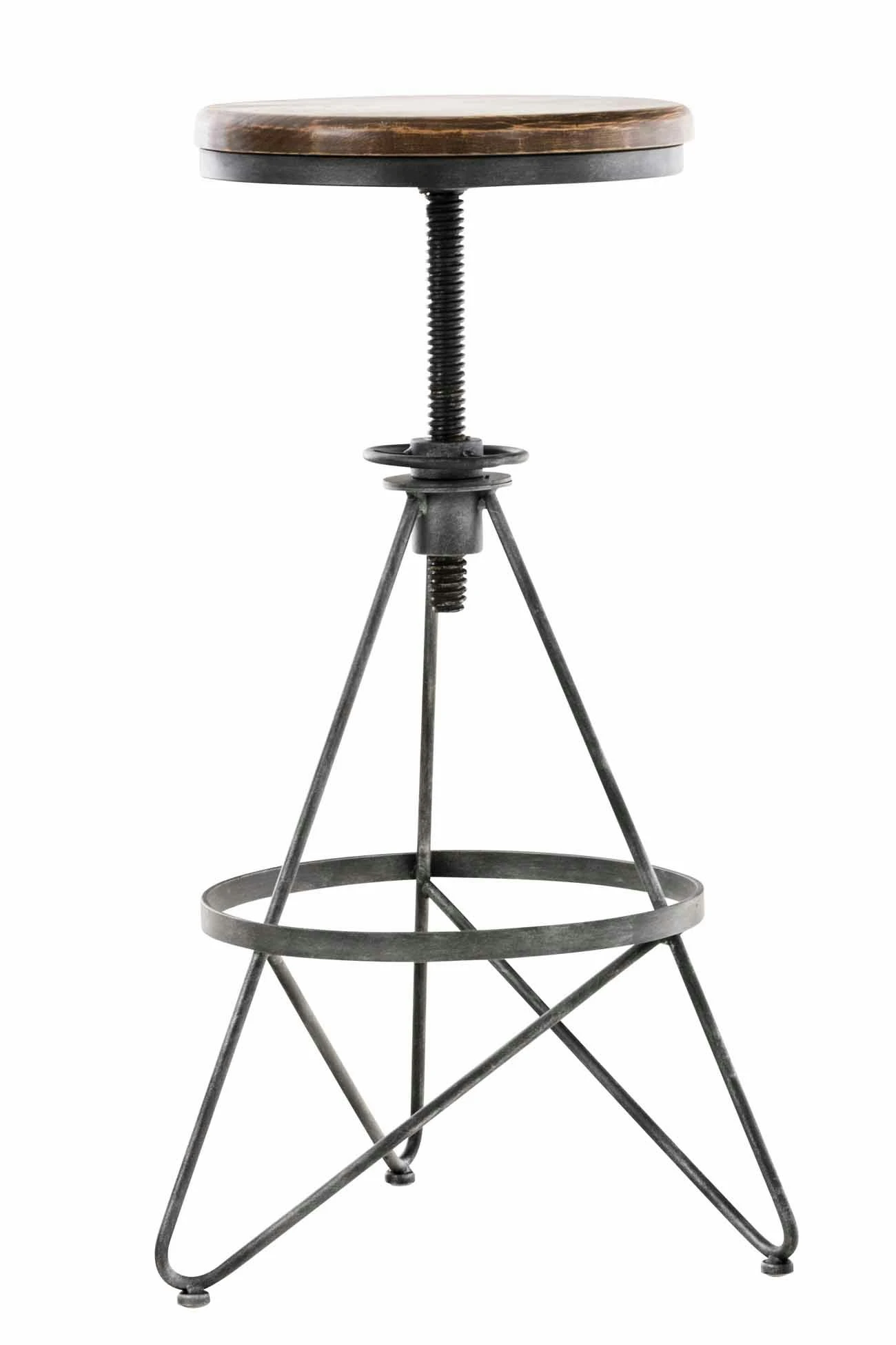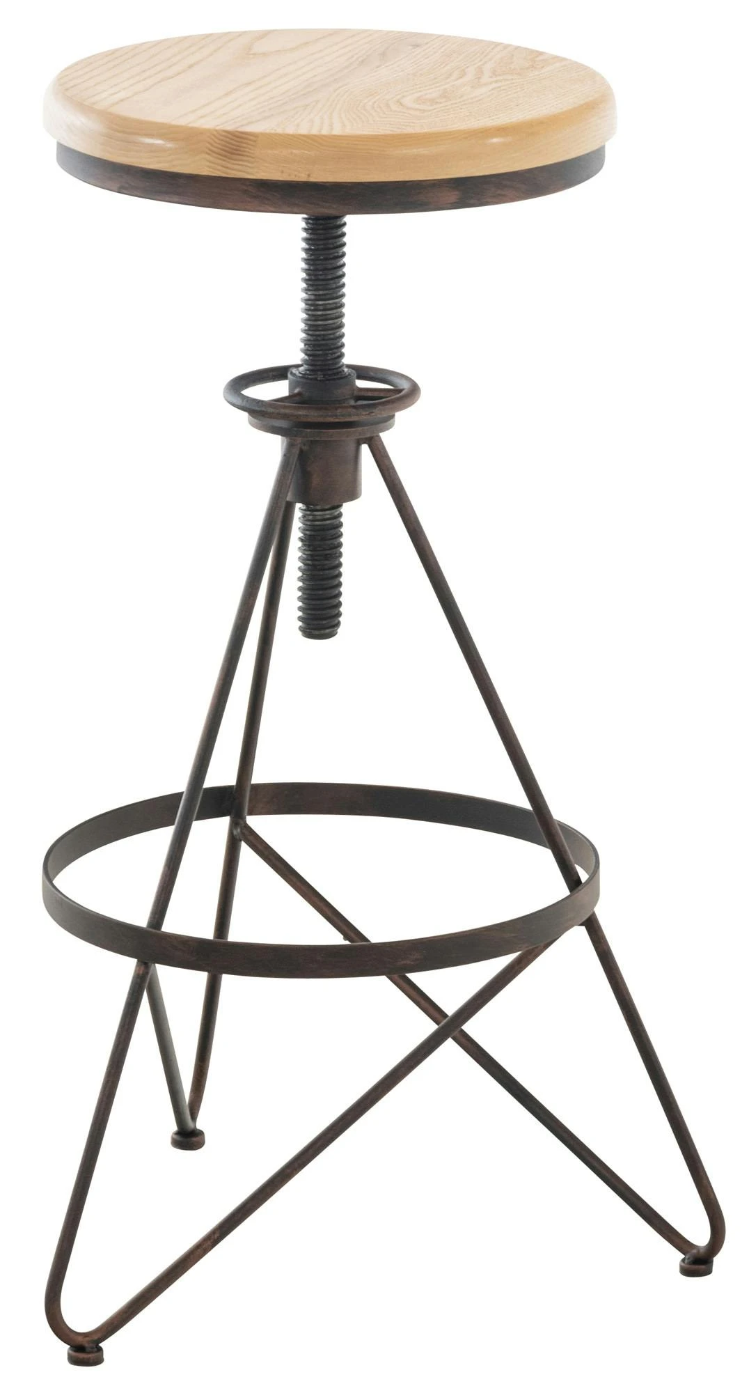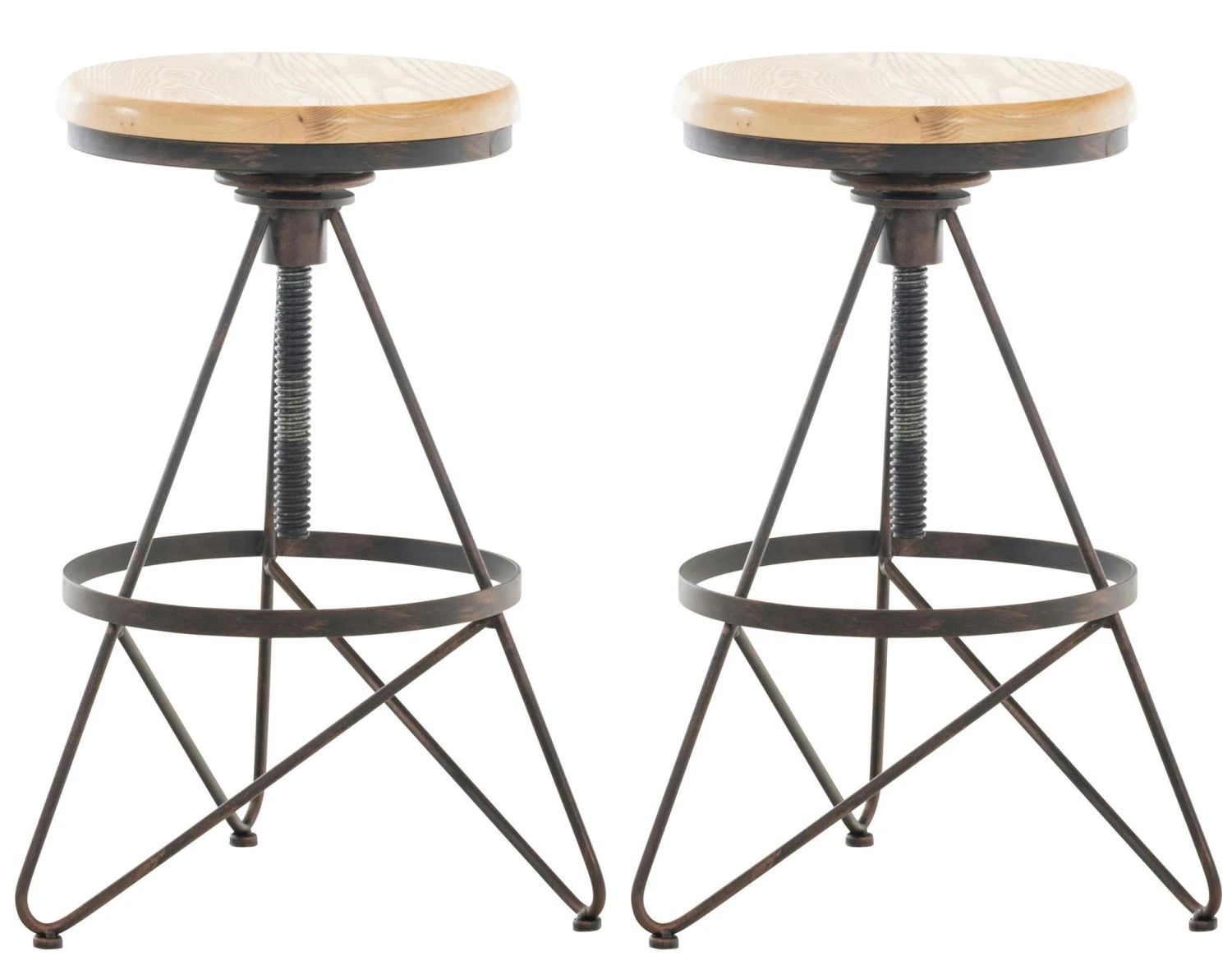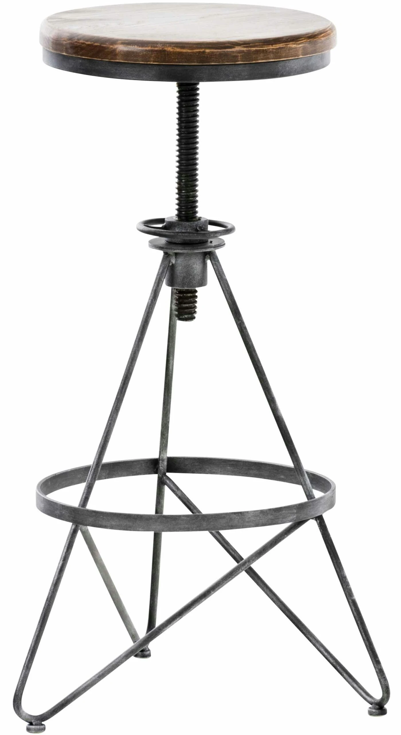 Außergewöhnlicher Look mit herkömmlichen Materialien, das macht diese Hocker zu einem ganz besonderen Blickfang. Auf dem beiden runden Sitz aus Eschenholz lässt es sich, auch ohne jede Polsterung, gemütlich verweilen. Die individuelle Höhenverstellung ermöglicht besten Sitzkomfort. Für zusätzliche Bequemlichkeit sorgt die Fußablage, die rings um das Gestell verläuft. Das robuste 3-Fuß Gestell besteht aus Metall und garantiert höchste Stabilität und Standfestigkeit.