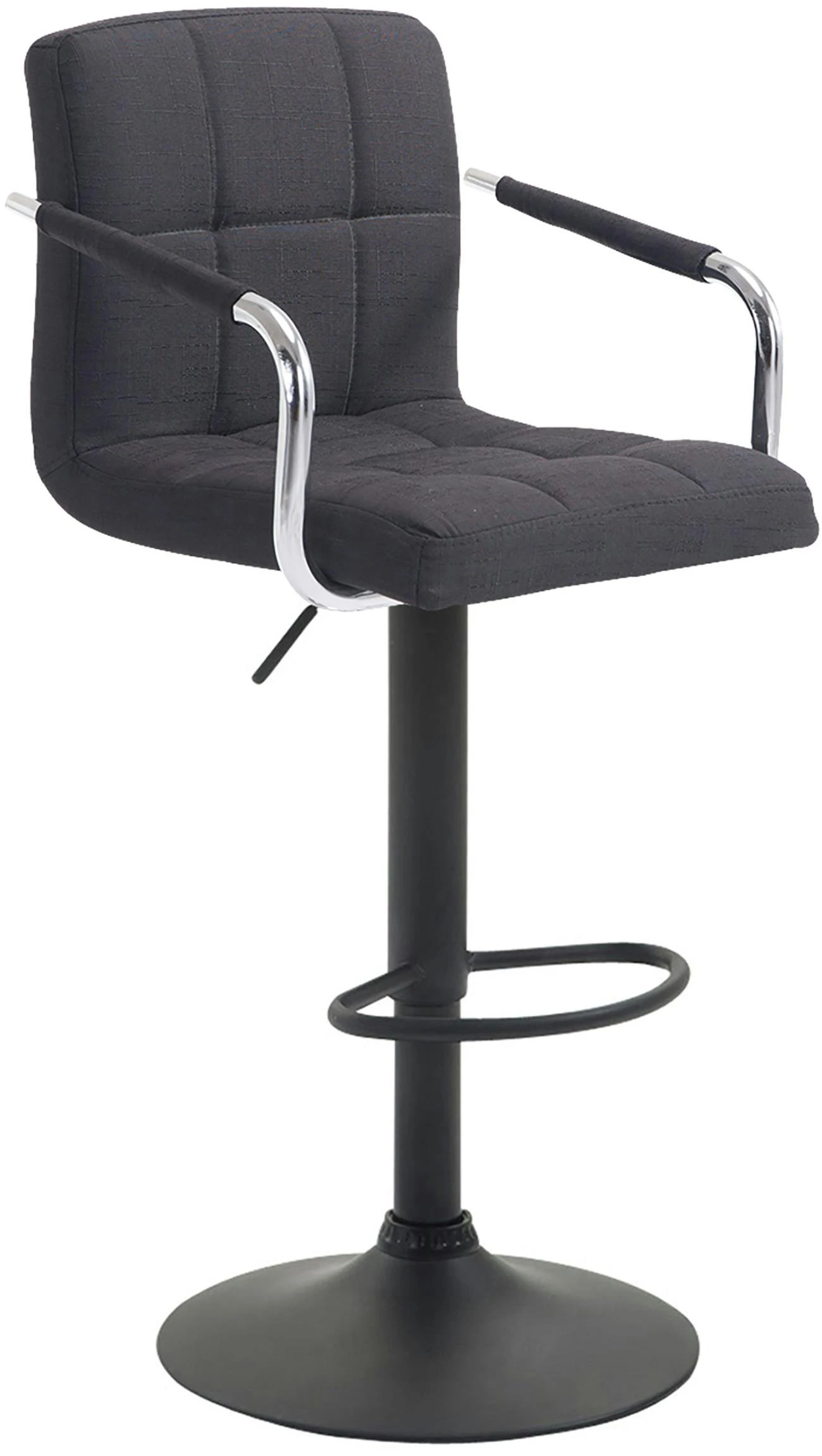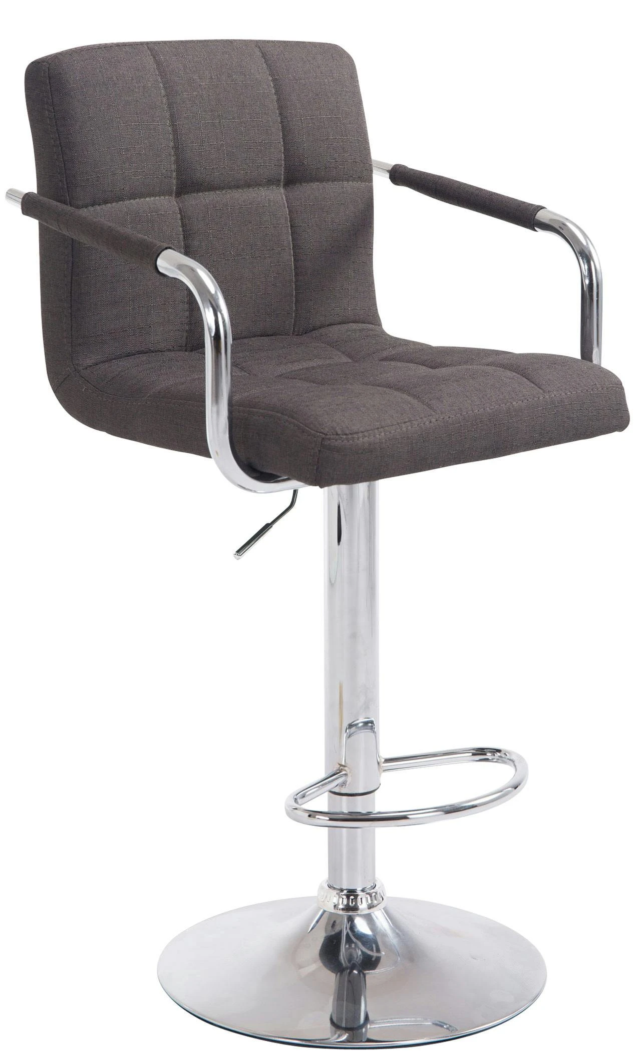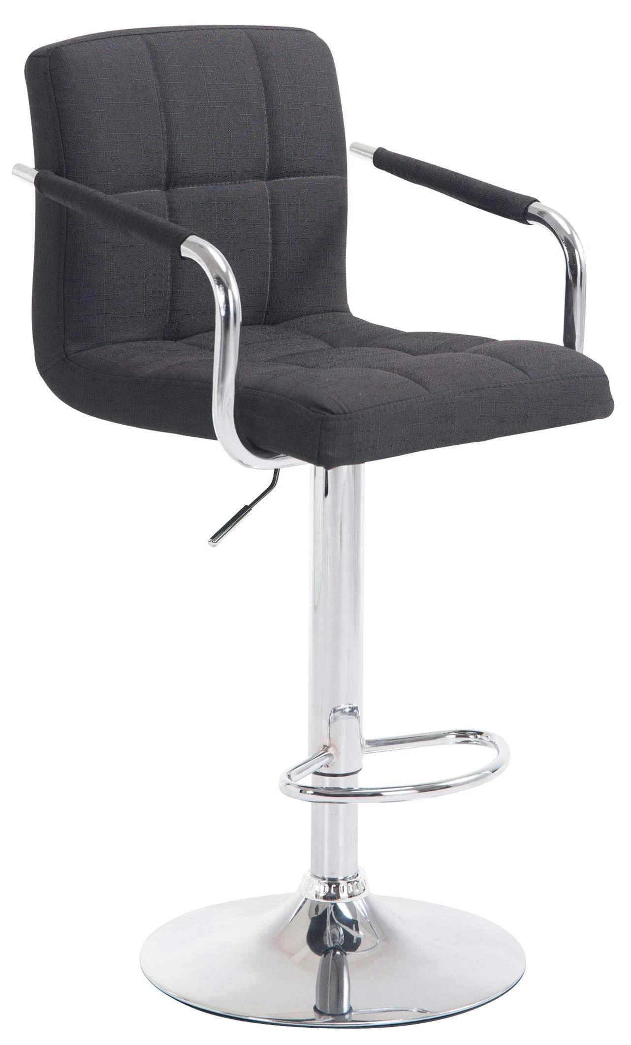 Dieser Barhocker ist ein echter Blickfang im modernen, dennoch zeitlosen Design. Die bequeme Polsterung, Rückenlehne, Armlehnen und ergonomische Fußstütze sorgen für ein bequemes Sitzen auch über mehrere Stunden hinweg. Die Polsterung ist dabei mit Stoff bezogen, welcher mit stilvollen Ziernähten versehen ist. Eine um 360° drehbare Sitzfläche macht den Barhocker zusätzlich von jeder Seite komfortabel nutzbar. Zudem ist er mittels eines Gaslifts stufenlos höhenverstellbar und dadurch für jede Thekenhöhe bestens geeignet.