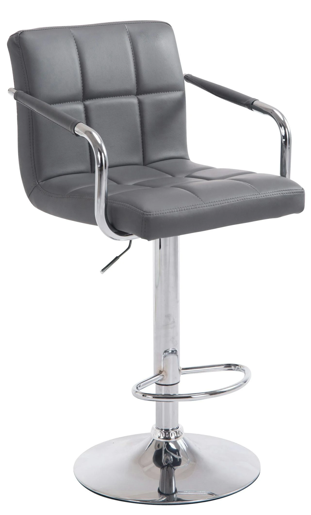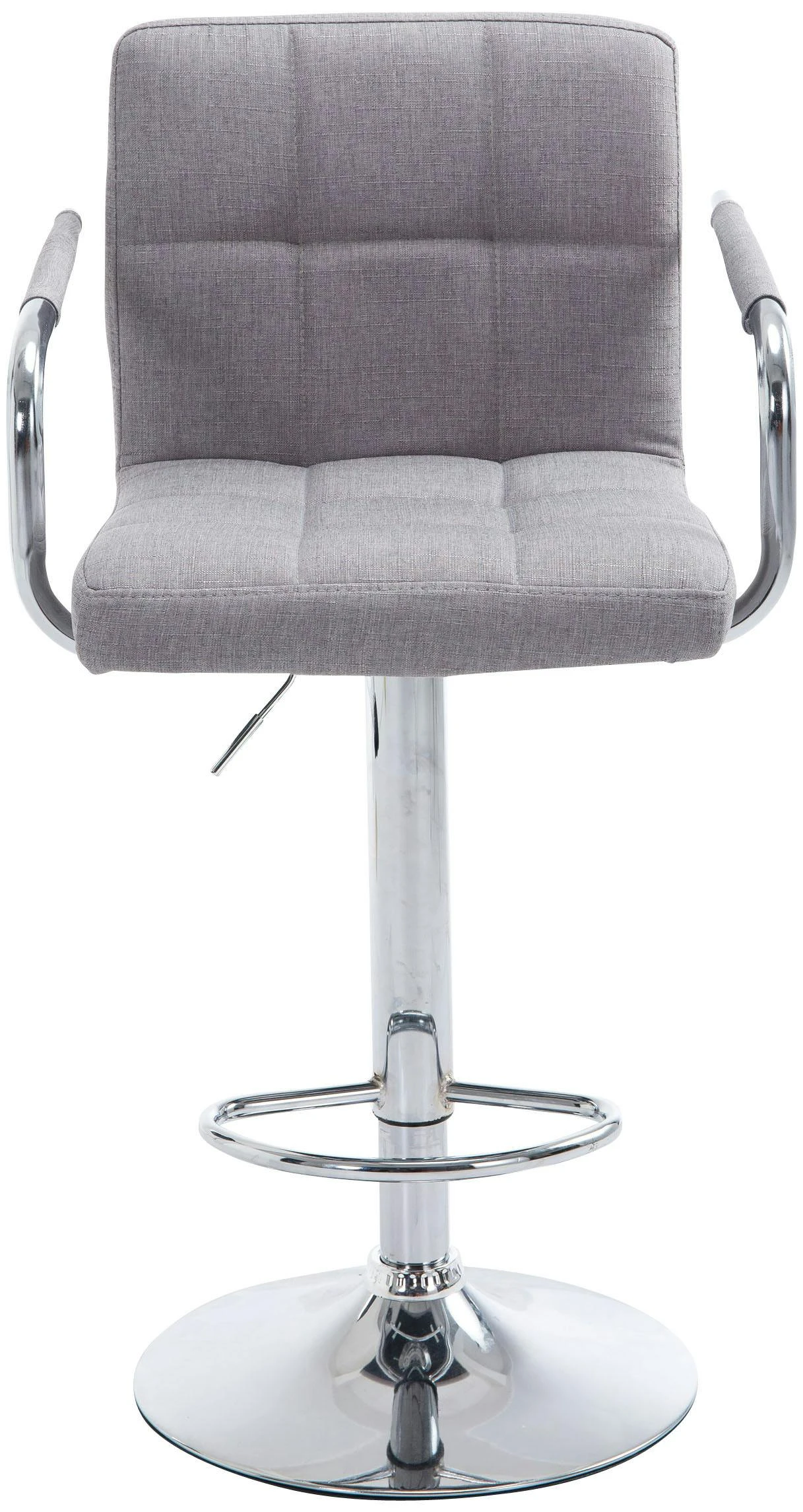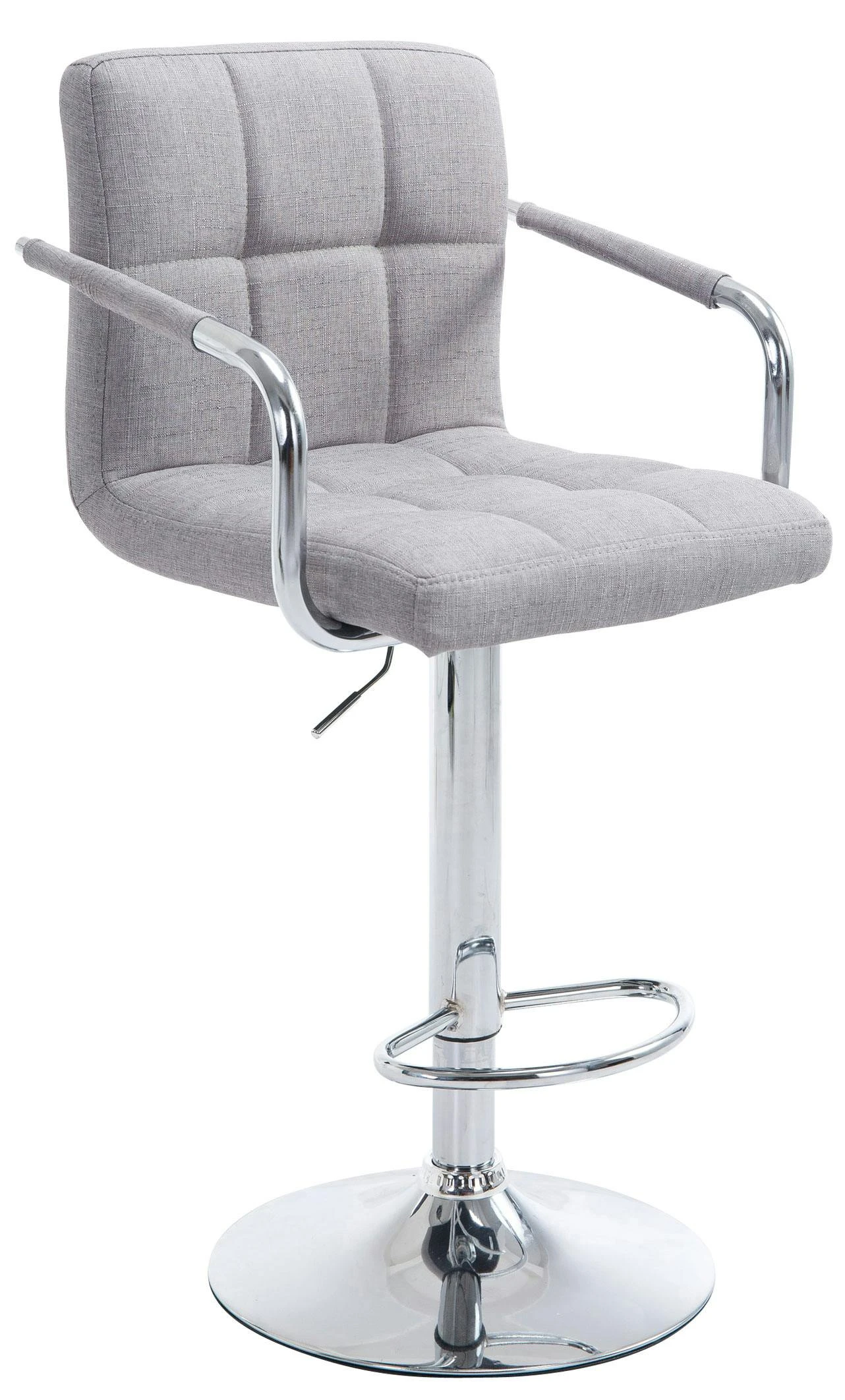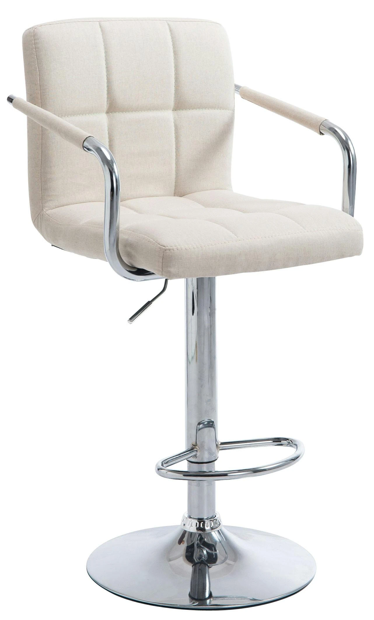 Dieser Barhocker ist ein echter Blickfang im modernen, dennoch zeitlosen Design. Die bequeme Polsterung, Rückenlehne, Armlehnen und ergonomische Fußstütze sorgen für ein bequemes Sitzen auch über mehrere Stunden hinweg. Die Polsterung ist dabei mit Stoff bezogen, welcher mit stilvollen Ziernähten versehen ist. Eine um 360° drehbare Sitzfläche macht den Barhocker zusätzlich von jeder Seite komfortabel nutzbar. Zudem ist er mittels eines Gaslifts stufenlos höhenverstellbar und dadurch für jede Thekenhöhe bestens geeignet.