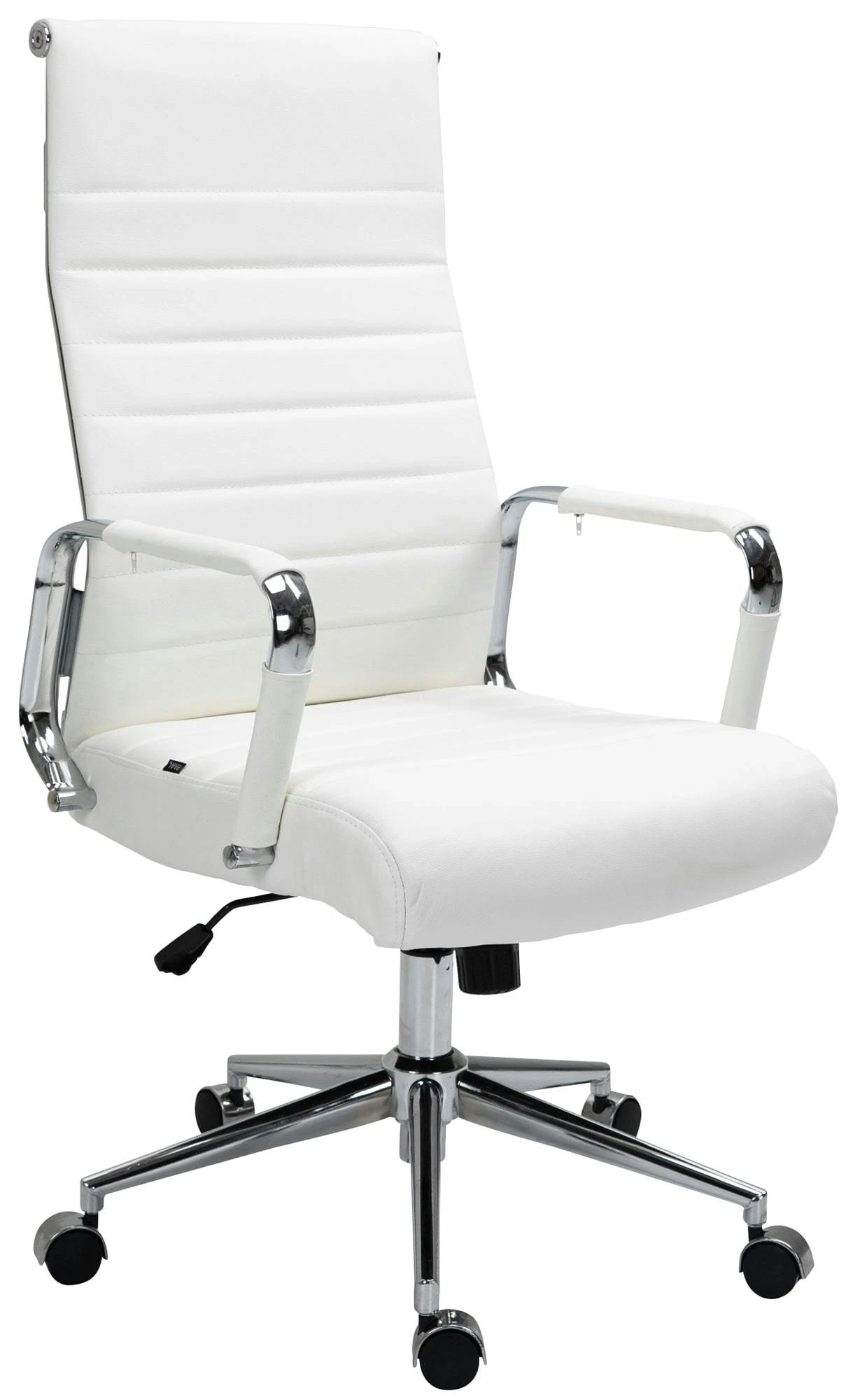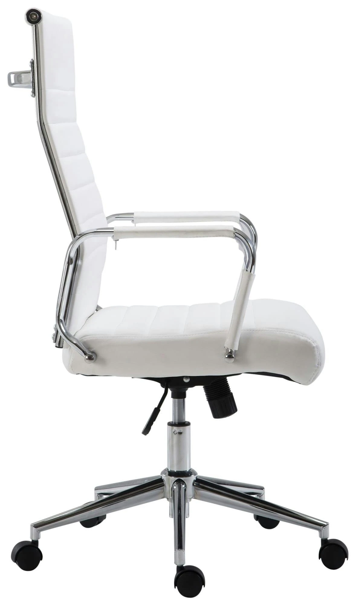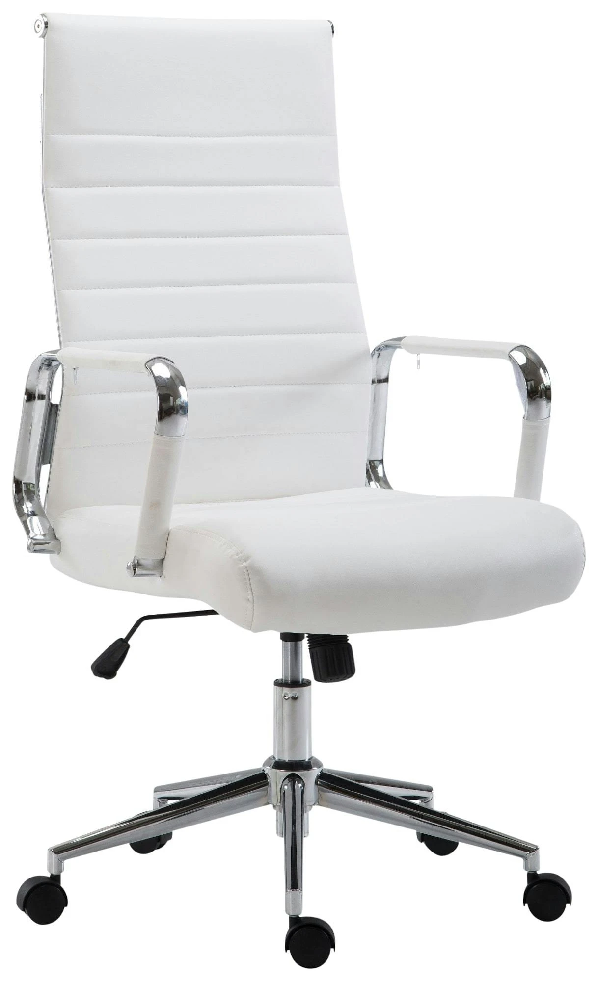 Der exklusive Bürostuhl Kolumbus überzeugt nicht nur mit seinem modernen Look, auch in Sachen Komfort kann ihm keiner etwas vormachen. Seine hochwertige Polsterung und der pflegeleichte Kunstlederbezug sorgen für ein angenehmes Sitzgefühl auch über mehrere Stunden. Zudem ist die Sitzhöhe stufenlos verstellbar und garantiert ein ergonomisches Sitzen. Des Weiteren ist der Schreibtischstuhl mit einem Wippmechanismus versehen, der für mehr Bewegungsfreiheit sorgt. Das elegante Metallgestell in Chrom-Optik und die stabil geschwungenen Armlehnen mit Kunstlederbezug geben dem Ganzen noch das gewisse Extra. Die Stabilität wird durch das Chromoptik Metallgestell gewährleistet, das mit dem schwarzen Bezug auch in Schwarz erhältlich ist. Durch die fünf Leichtlaufrollen kann man leicht und locker über den Boden rollen – egal ob auf Hart- oder Teppichböden.