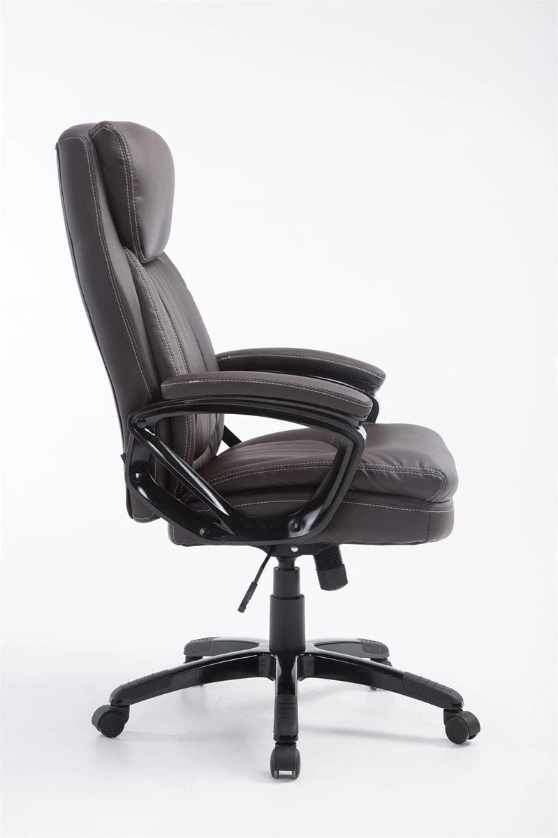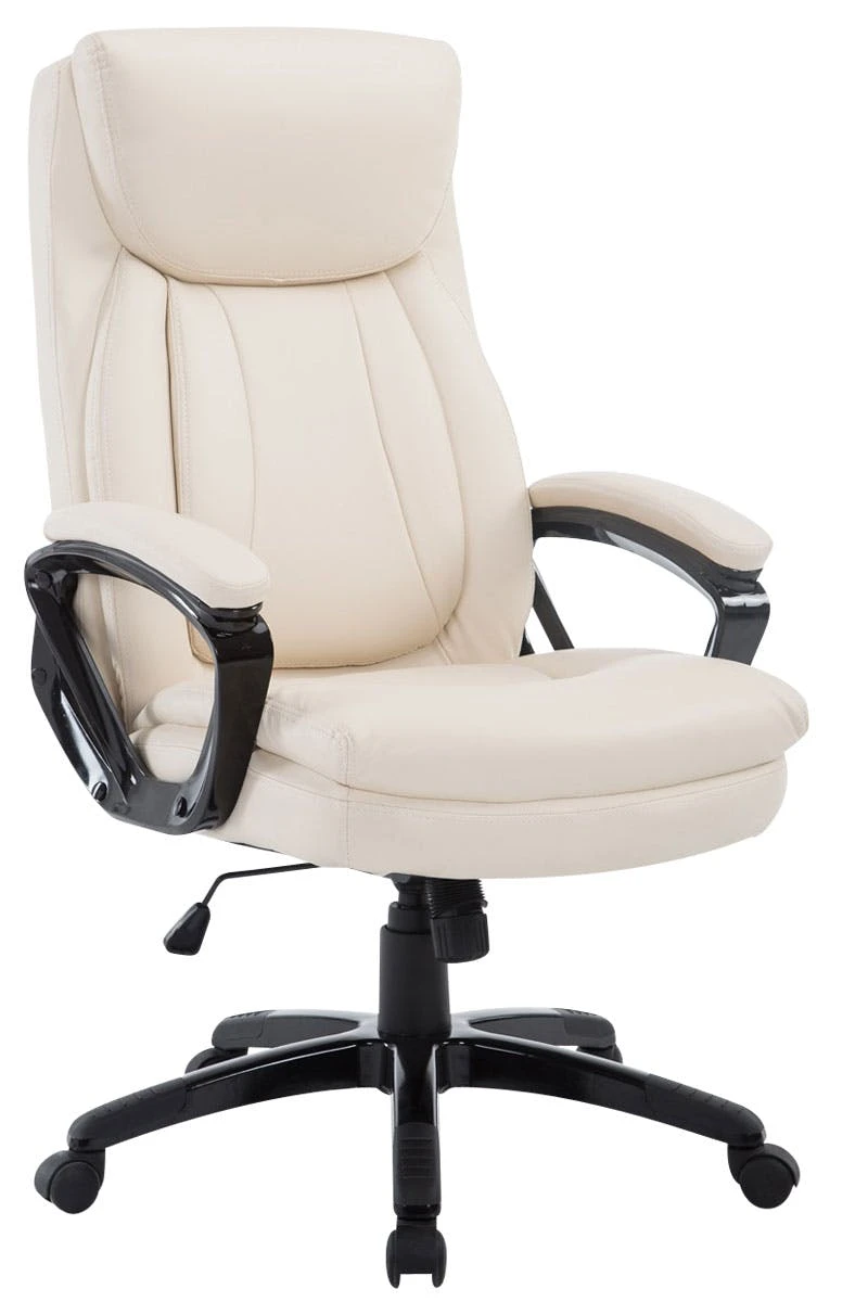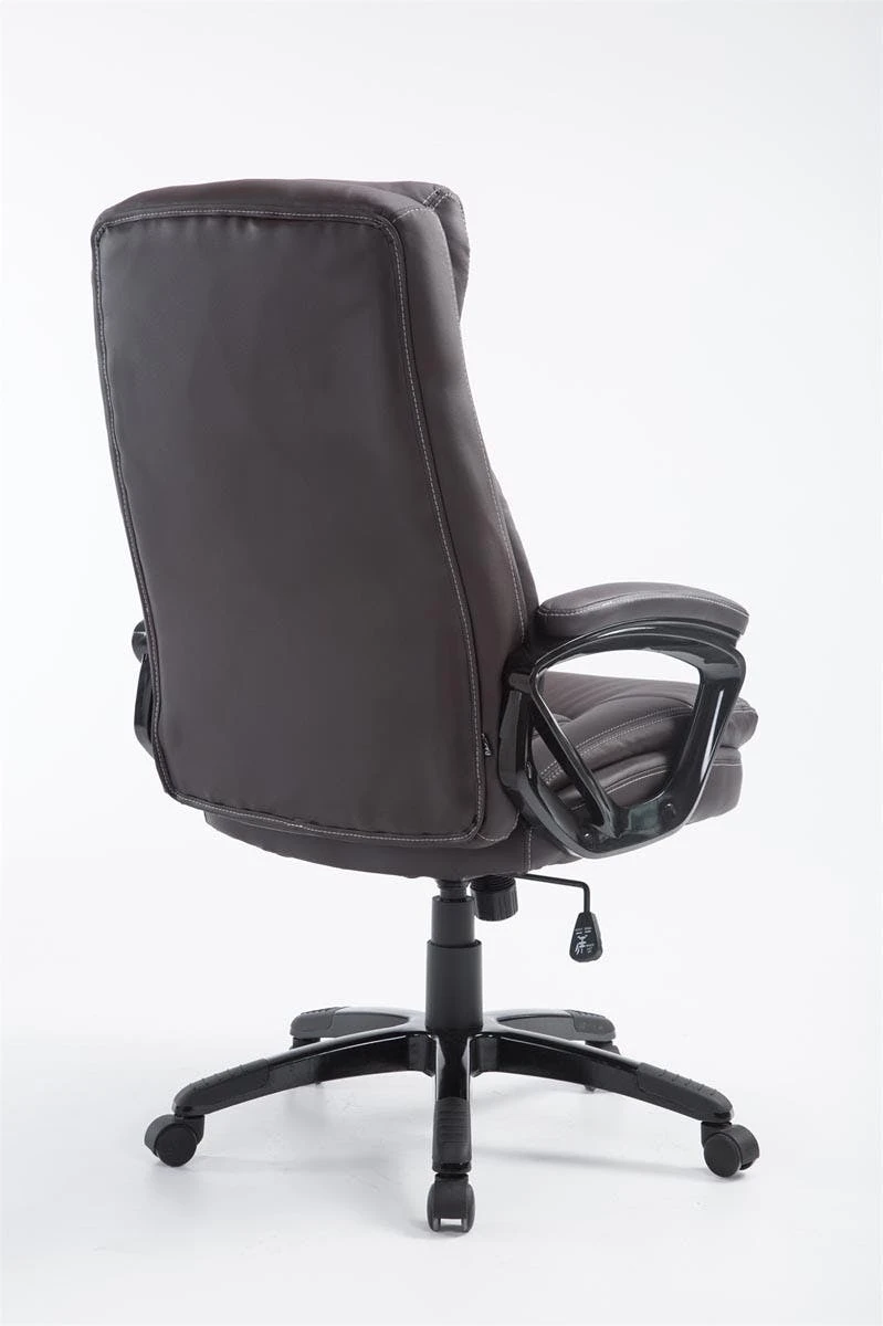 Der moderne Komfort-Chefsessel Platon mit Kunstlederbezug bietet den Vorteil, dass er besonders pflegeleicht ist. Kunstleder sieht nicht nur schön aus, sondern ist elastisch und zieht sich bei Entlastung wieder glatt, somit ist eine hohe Lebensdauer des Sitzbezuges garantiert. Die extra hohe Rückenlehne mit ausgeformtem Polster im Kopfbereich, aber auch die weiche Polsterung der Armlehnen, ermöglichen ein angenehmes Arbeiten. Die stufenlos verstellbare Sitzhöhe sowie der individuell arretierbare Wippmechanismus sorgen für mehr Bewegungsfreiheit. Das Gestell des Drehstuhls besteht aus stabilem Kunststoff und steht auf fünf robusten Kunststofflaufrollen. Egal ob Hart- oder Teppichböden – Sie werden immer leicht und locker über den Boden rollen können. Der Bürostuhl wird zerlegt angeliefert.