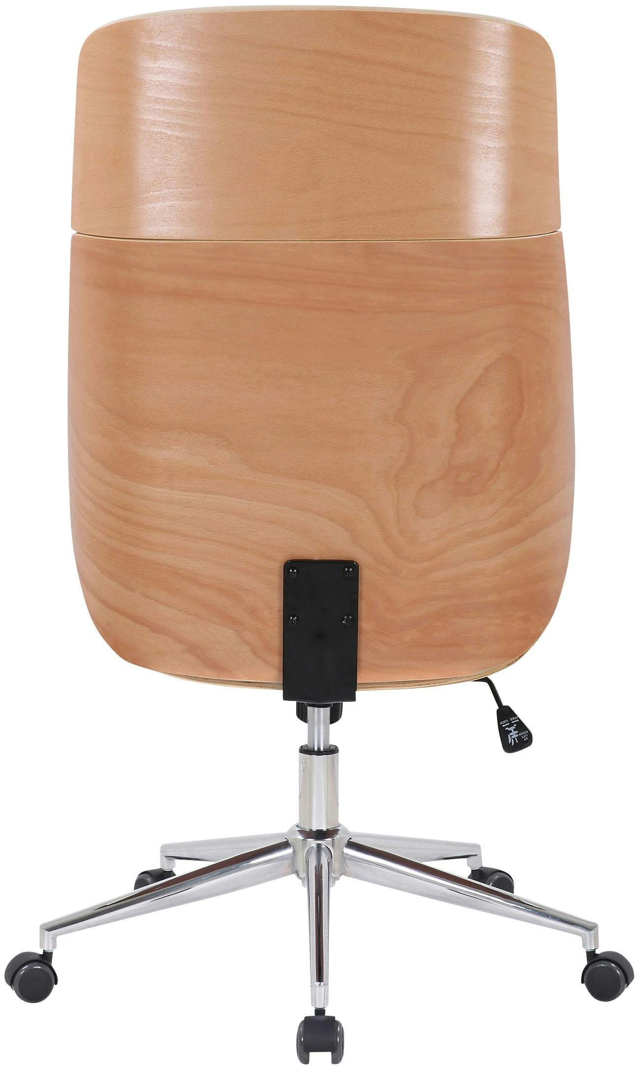 Dieser Bürostuhl Varel überzeugt nicht nur mit seinem modernen Look, auch in Sachen Komfort kann ihm keiner etwas vormachen. Der Drehstuhl ist angenehm gepolstert und mit einem Kunstlederbezug versehen wodurch er besonders pflegeleicht ist. Durch die stufenlose Höhenverstellbarkeit und den Wippmechanismus wird komfortables Sitzen auch über mehrere Stunden ermöglicht. Die Stabilität ist durch das Metallgestell in Chromoptik gewährleistet. Durch die fünf Leichtlaufrollen kann man leicht und locker über den Boden rollen – egal ob auf Hart- oder Teppichböden. Das elegante Chromgestell und der Mix aus Kunstleder und Holz geben dem Ganzen noch das gewisse Extra und runden das Design ab.