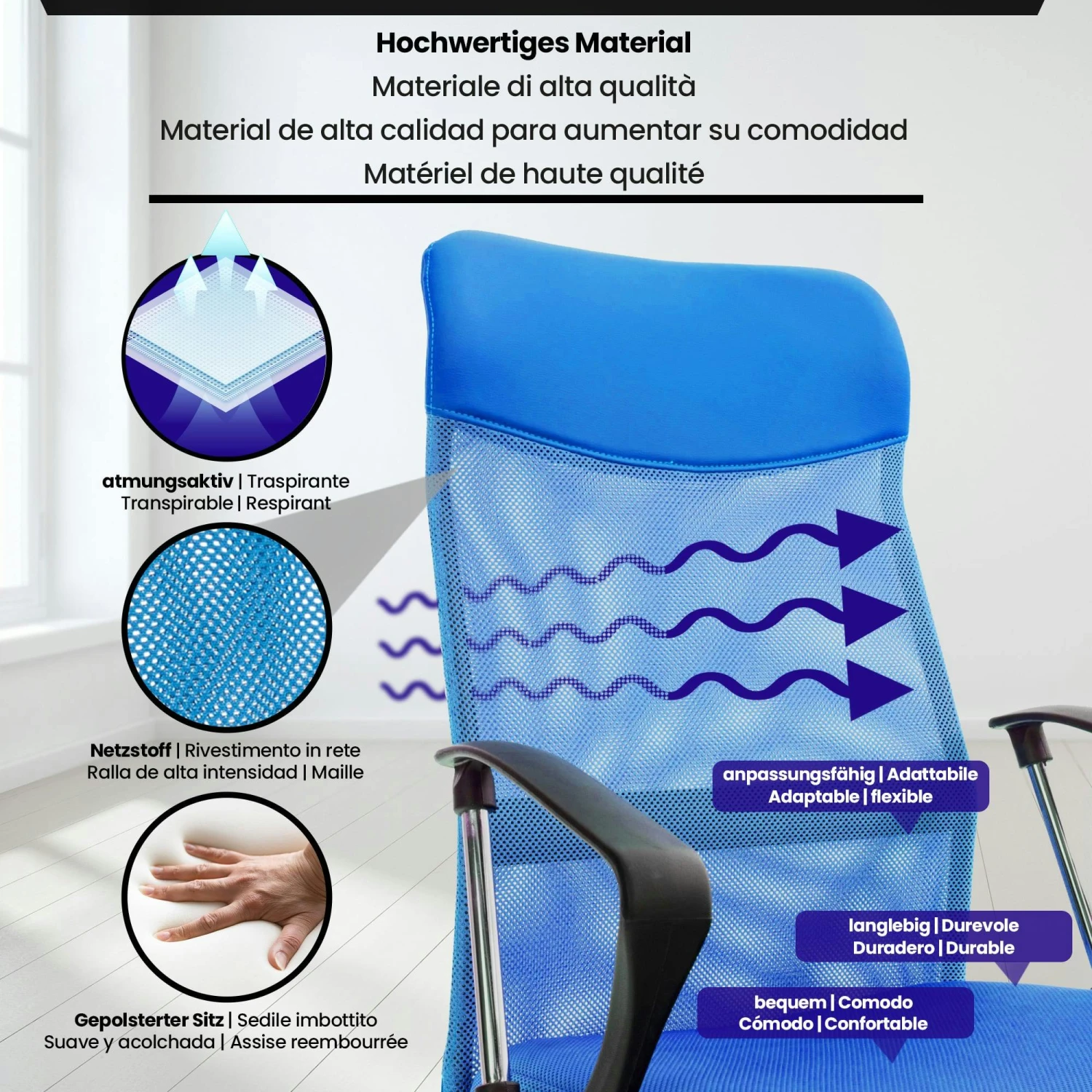 Die Wippmechanik entlastet die Bandscheiben, wobei die Stärke über einen Drehregler unter der Sitzfläche adjustiert werden kann. Für weiteren Komfort, auch bei wärmeren Tagen, sorgt die atmungsaktive Netzbespannung. Im Kopf-Bereich besteht die Rückenlehne aus Kunstleder.