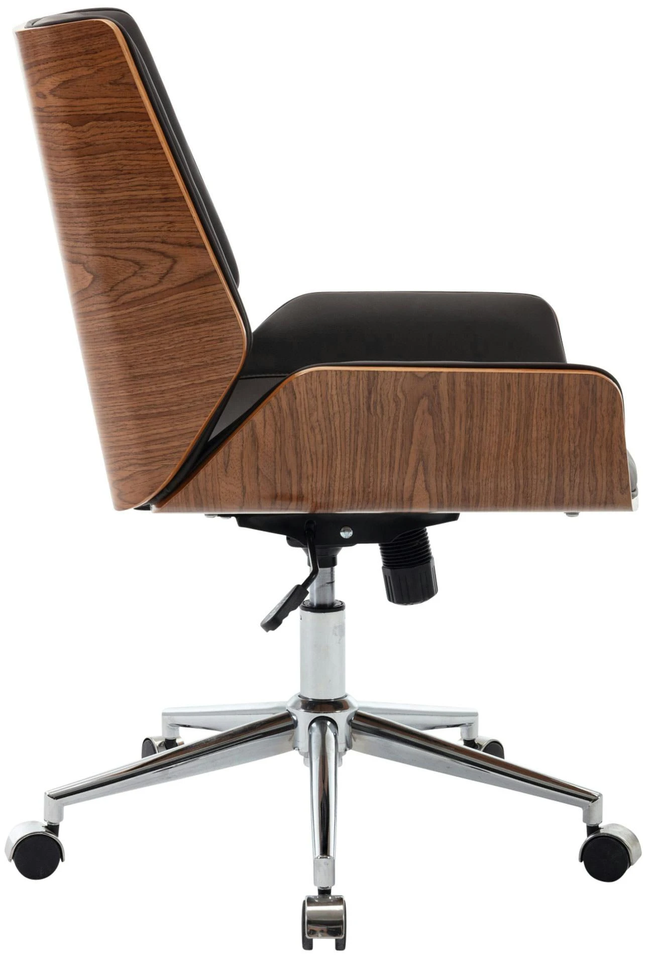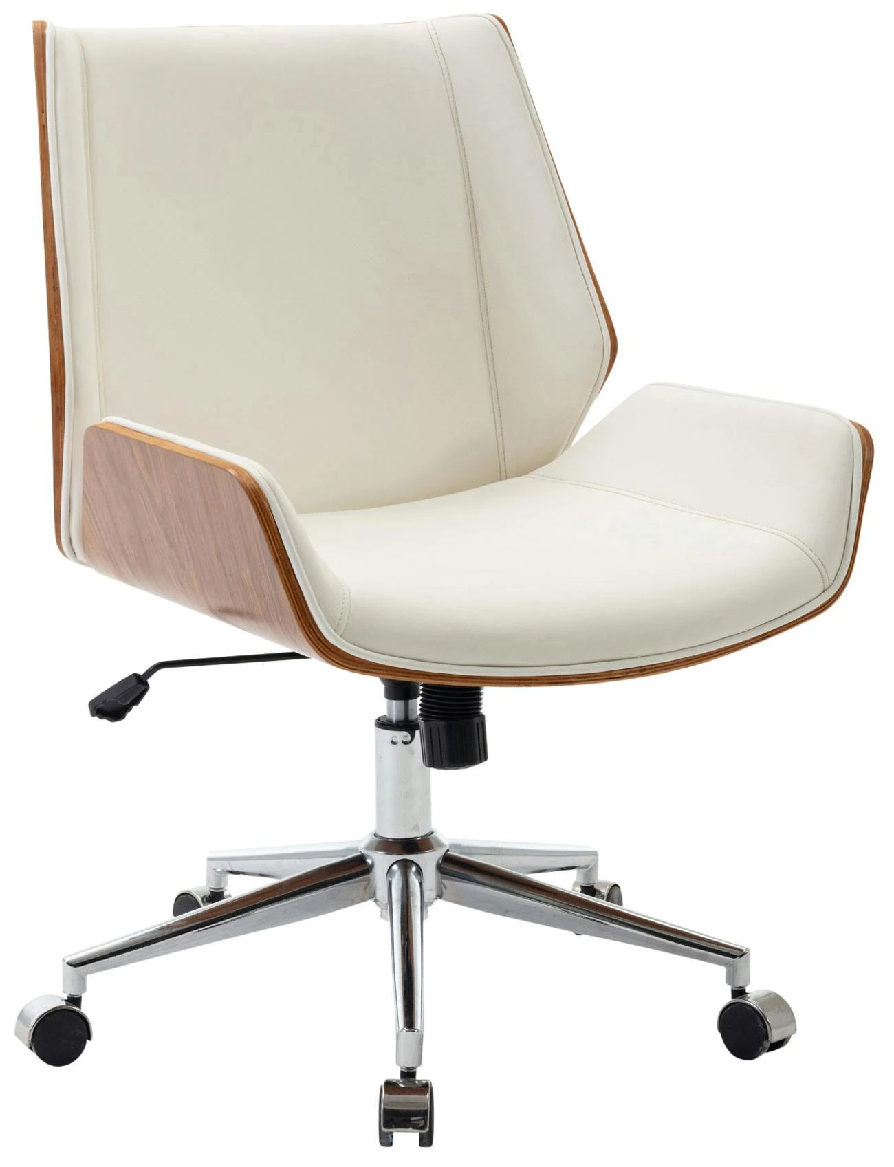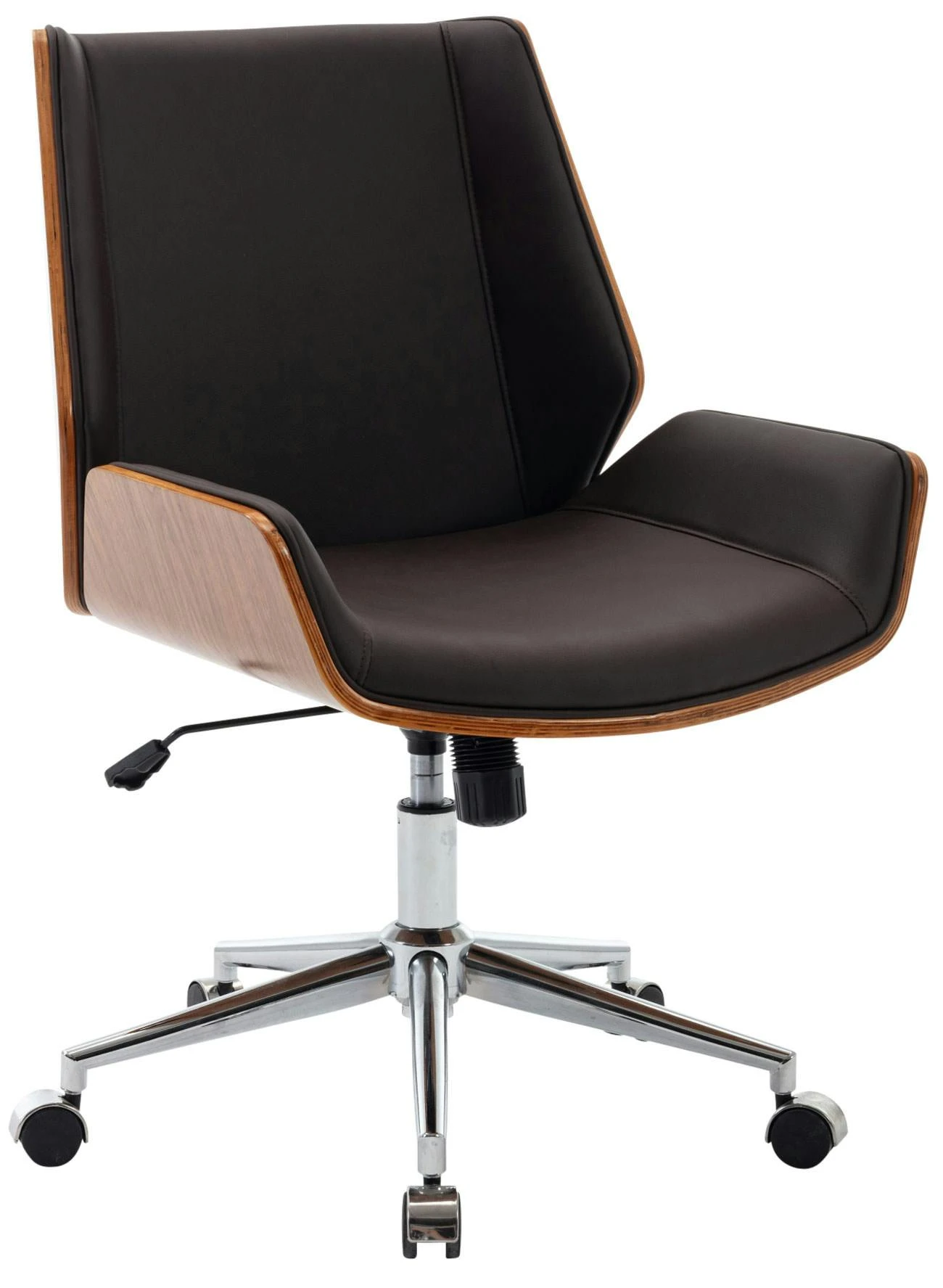 Kunstlederbezüge haben den Vorteil, dass sie elastisch sind und sich bei Entlastung wieder glatt ziehen. Dies sieht nicht nur schöner aus, sondern erhöht zusätzlich die Lebensdauer des Sitzbezuges. Der Holzrahmen macht diesen Drehstuhl zum absoluten Hingucker und verleiht ihm ein edles Design. Dank der stufenlos verstellbaren Sitzhöhe ist ergonomisches Sitzen garantiert und der eingebaute Wippmechanismus sorgt für mehr Bewegungsfreiheit. Das Gestell ist aus Metall in Chromoptik und sehr stabil. Der Schreibtischstuhl steht standsicher auf fünf Leichtlaufrollen. Egal ob Hart- oder Teppichböden – man kann immer leicht und locker über den Boden rollen.