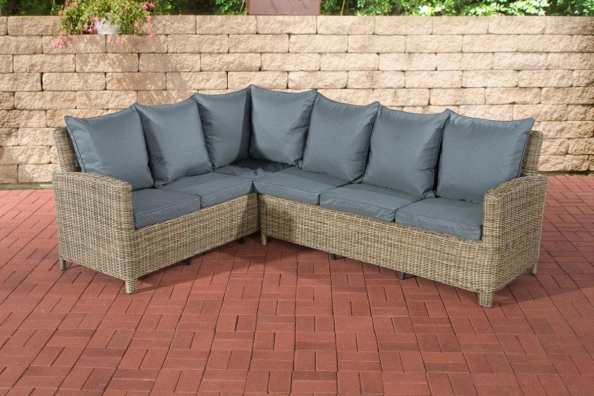 Das besonders gut für die Verwendung im Außenbereich geeignete UV-beständige Material Polyrattan sieht aus wie herkömmliches Rattangeflecht, ist aber viel robuster. Die hochwertig verarbeiteten 5 mm dicken, runden Polyrattanfasern sind wasserfest, angenehm pflegeleicht und UV-beständig, sodass sie auch bei häufiger und langjähriger Nutzung unverändert ihre Farbtiefe behalten. Dieser edle Farbton sorgt in Kombination mit einer leichten Struktur für das absolut natürliche Erscheinungsbild dieser Möbelgarnitur.