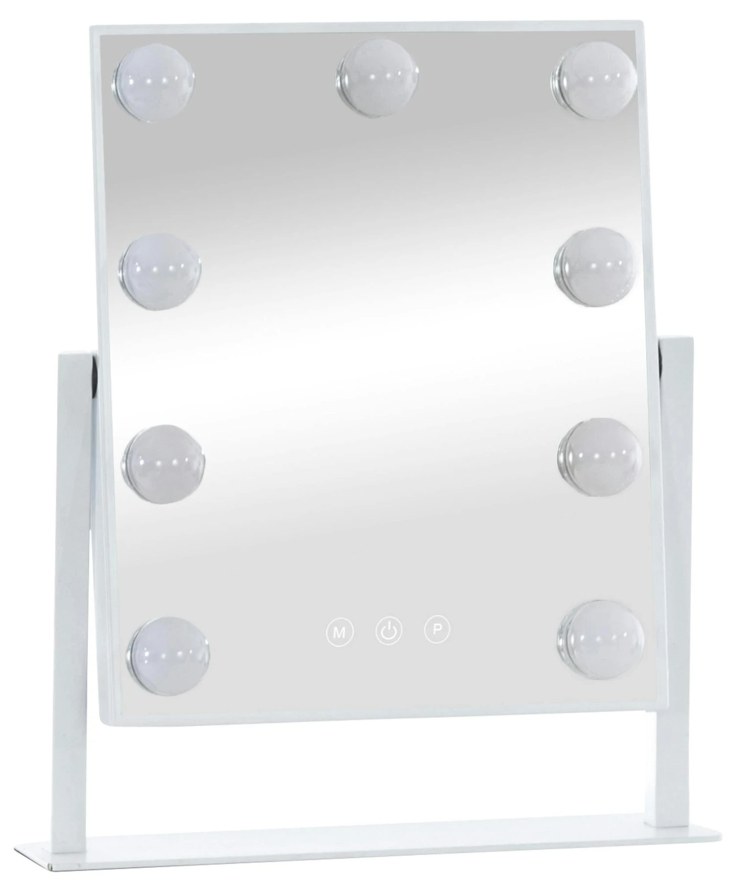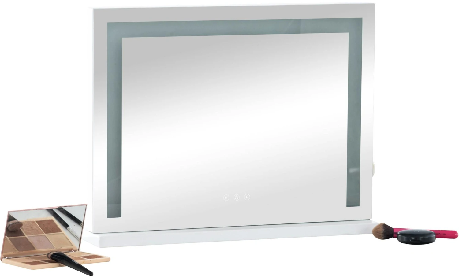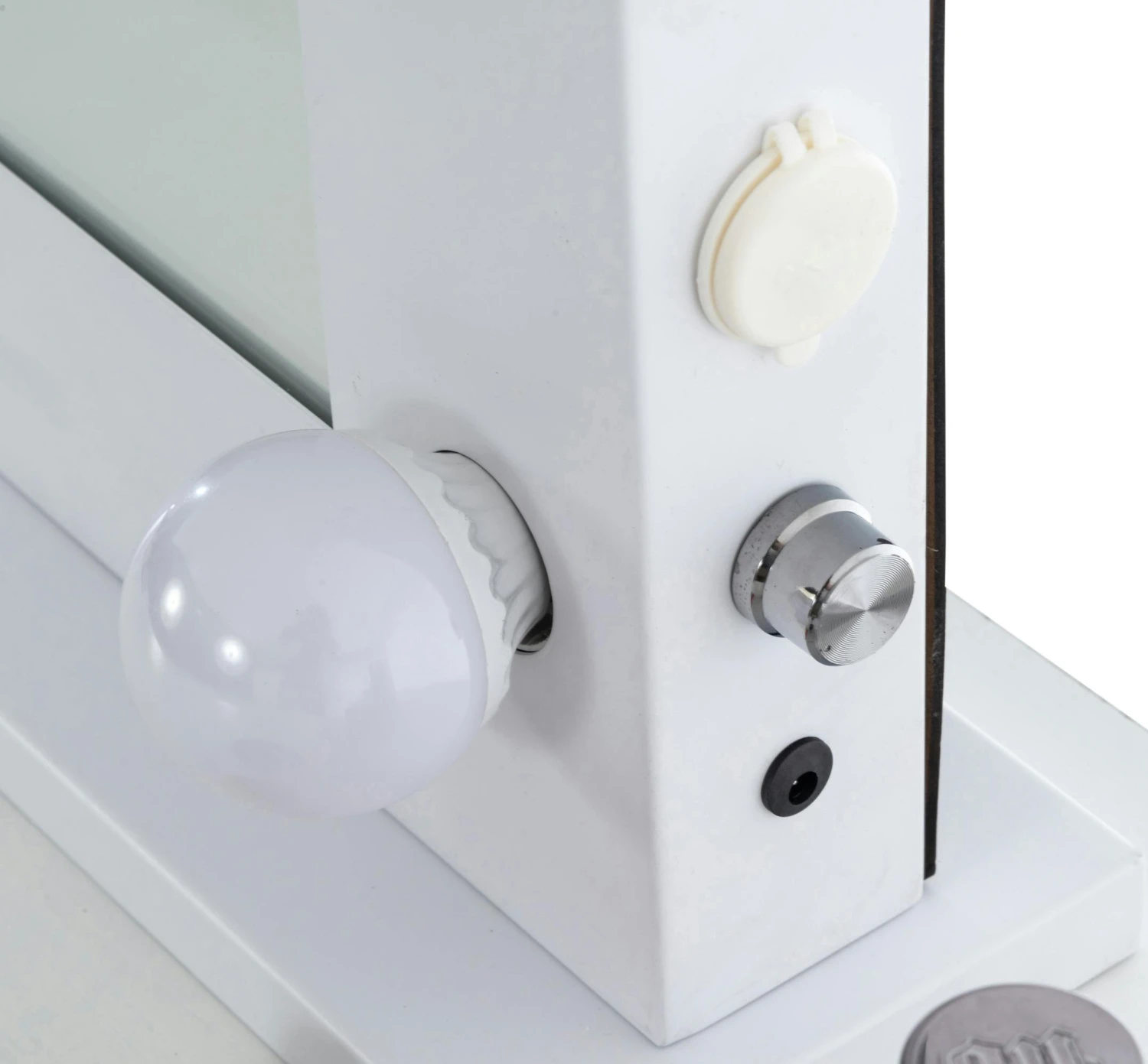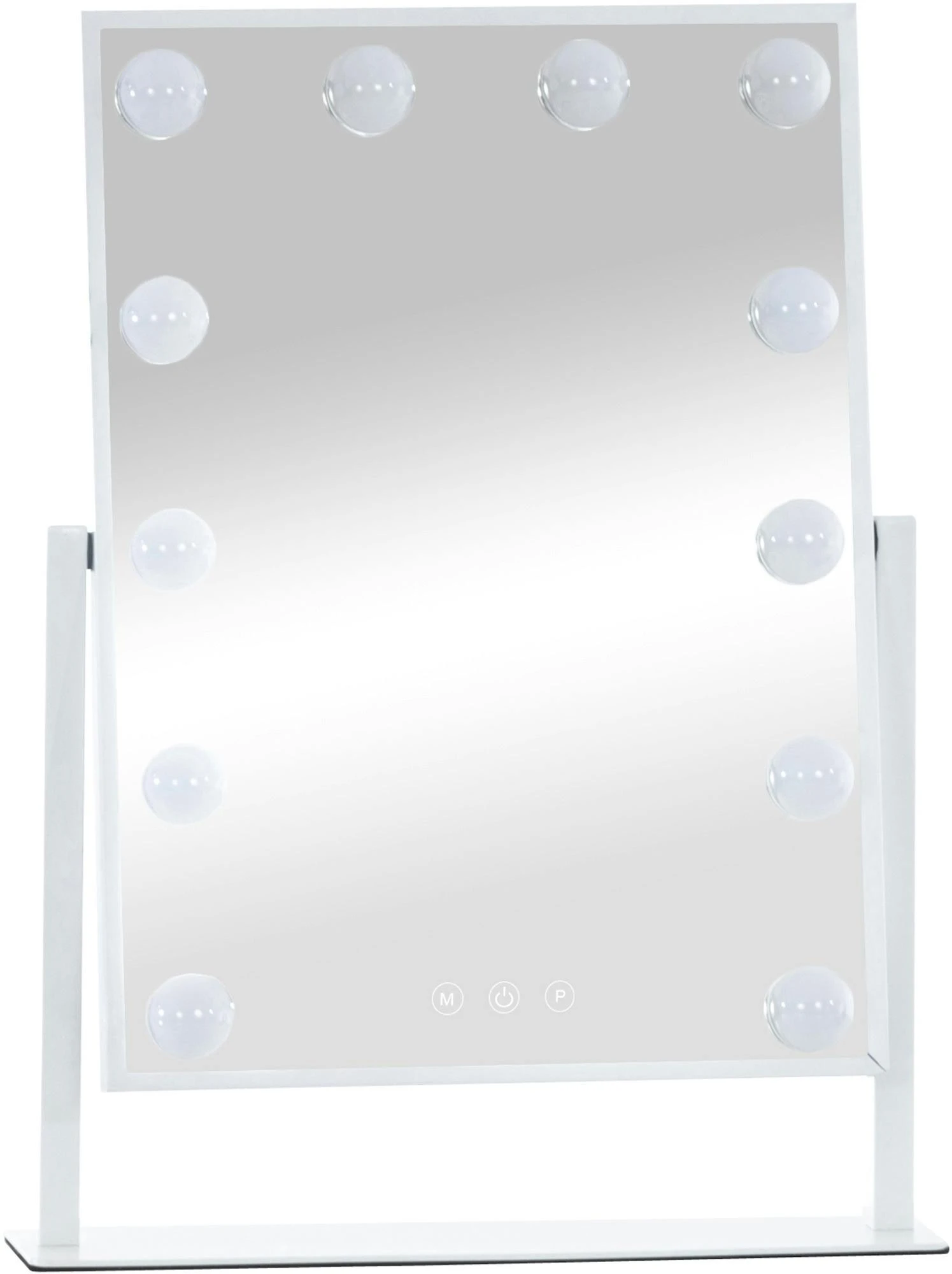 Der Schminkspiegel Visalia ist umlaufend mit 12 energiesparenden LED-Leuchten versehen. Das ermöglicht eine optimale Ausleuchtung. Für die perfekte Lichtregulierung ist der Spiegel seitlich mit einem Dimmer ausgestattet über den die Helligkeit reguliert wird. Des Weiteren ist der Spiegel seitlich mit einem USB-Port versehen und ermöglicht das Aufladen des Smartphones oder anderer USB-Geräte. Ein stillvoller Hollywood Spiegel, der das Ambiente edel aufwertet.