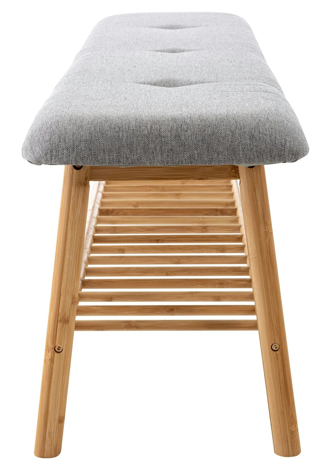 Die gepolsterte Bambus Schuhbank setzt nordische Akzente in der Garderobe. Der helle, freundliche Holzton des Schuhregals fügt sich in jede Einrichtung. Die moderne Bank ist eine gelungene Kombination aus Sitzbank und Schuhregal. Mit einer bequem gepolsterten Sitzfläche ausgestattet eignet sie sich ideal zum An- und Ausziehen von Schuhen und Stiefeln. Das Gestelle ist aus hochwertigem Bambus gefertigt, welches hart und widerstandsfähig ist. In dem hohen Fach kann man Herren- und Damenschuhe unterbringen. Die gemütliche Garderobenbank mit praktischem Stauraum ist eine sinnvolle und stilsichere Ergänzung im Eingangsbereich.