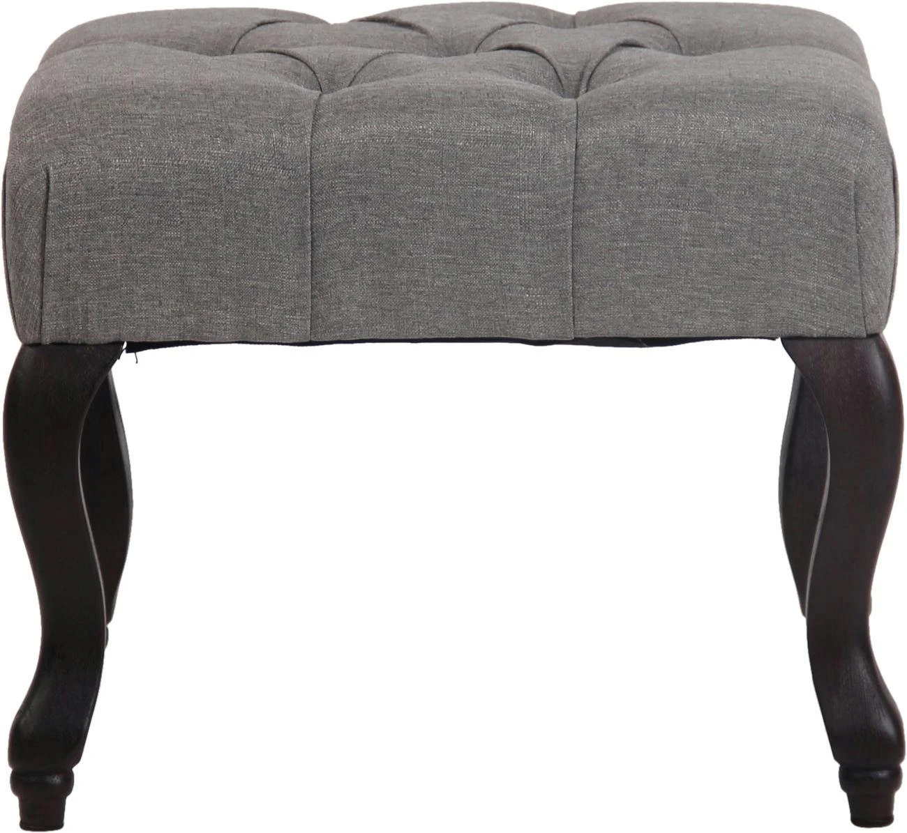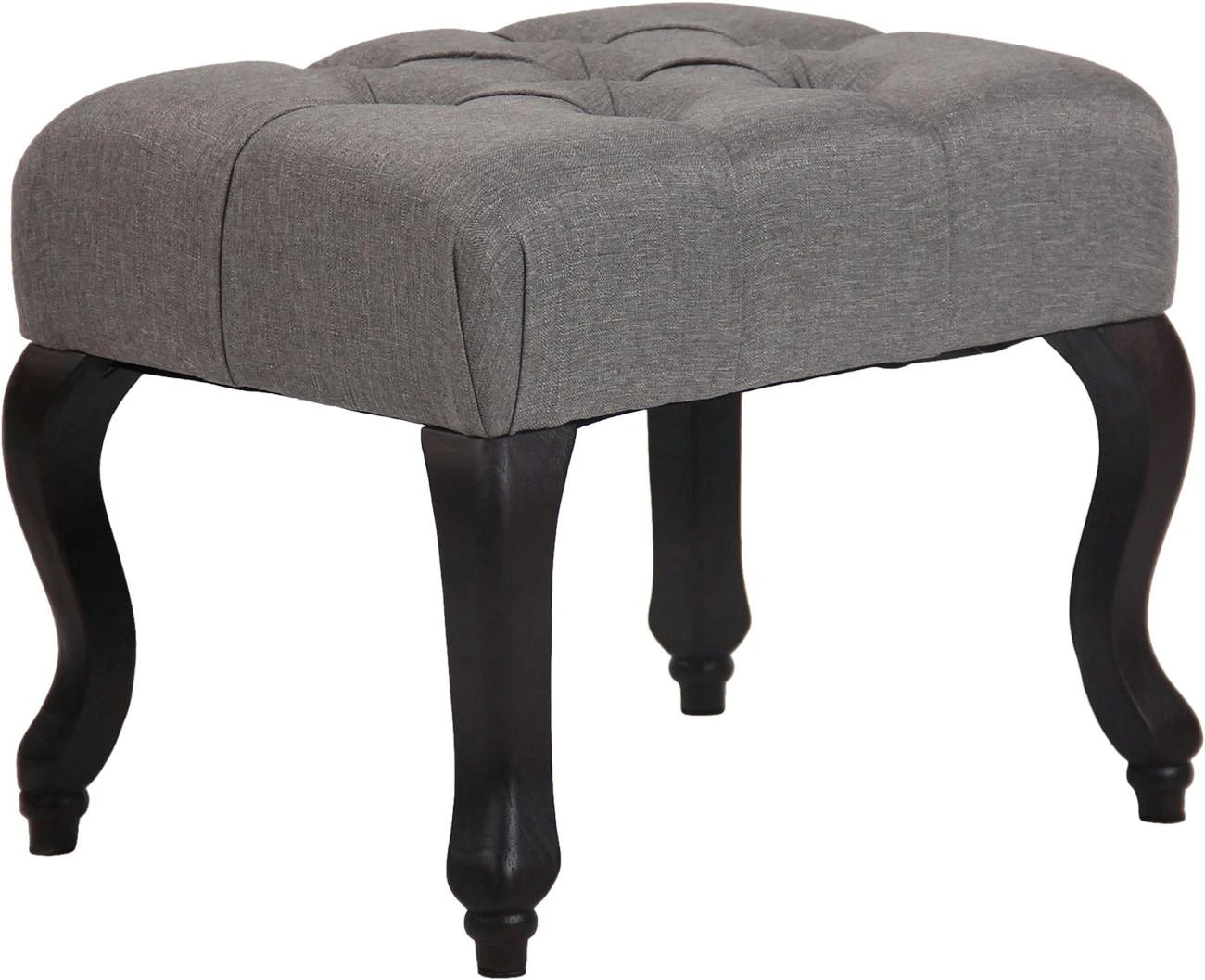 Dieser wunderschöne Sitzhocker im Chesterfield Design überzeugt mit seinem komfortablen Sitzpolster und seinen verzierten Stuhlbeinen. Das Polster ist mit einem gesteppten Stoffbezug versehen. Die geschwungenen Beine aus Kautschukholz geben dem Hocker seinen nötigen Halt und runden den Look ab. Da die Beine mit Bodenschonern versehen sind, werden Kratzer und Beschädigungen auf dem Boden verhindert. Der Schminkhocker verleiht jedem Wohnraum ein elegantes Ambiente.